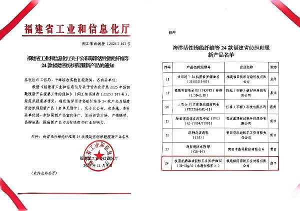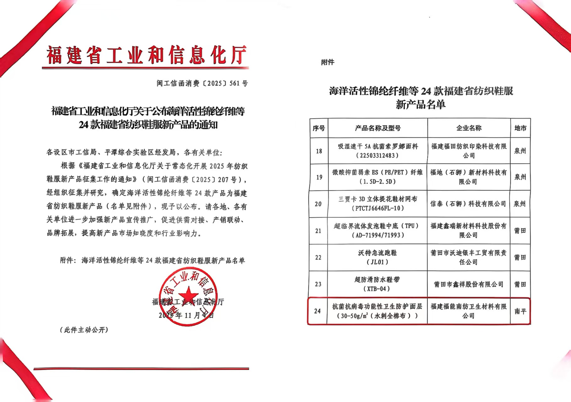 近日,公司1項(xiàng)新產(chǎn)品“抗菌抗病毒功能性衛(wèi)生防護(hù)面層(30-50克(水刺全棉布))”經(jīng)省工信廳組織專家審核、線上答辯等程序獲得通過,成功列入2025年福建省紡織鞋服新產(chǎn)品(第二批),是南平市唯一獲得通過的企業(yè)。