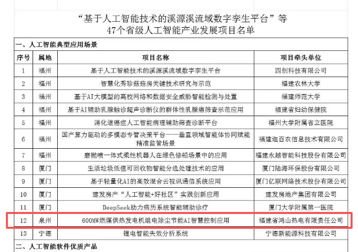 近日,福建省工業(yè)和信息化廳發(fā)布《關(guān)于公布“基于人工智能技術(shù)的溪源溪流域數(shù)字孿生平臺(tái)”等47個(gè)省級(jí)人工智能產(chǎn)業(yè)發(fā)展項(xiàng)目的通知》,公司自主申報(bào)的“600MW燃煤供熱發(fā)電機(jī)組電除塵節(jié)能AI智慧控制應(yīng)用”項(xiàng)目成功入選省級(jí)人工智能典型應(yīng)用場(chǎng)景,標(biāo)志著公司在人工智能與電力生產(chǎn)融合創(chuàng)新領(lǐng)域取得重要進(jìn)展。