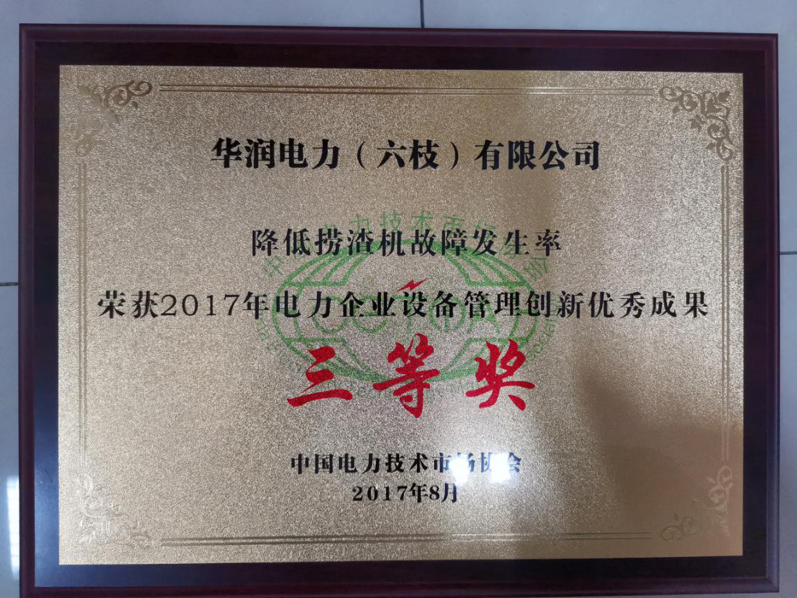 2017年獲得中國電力技術(shù)市場協(xié)會(huì)頒發(fā)的“2017年電力企業(yè)設(shè)備管理創(chuàng)新優(yōu)秀成果 三等獎(jiǎng)”